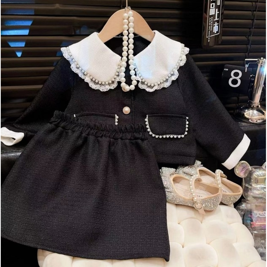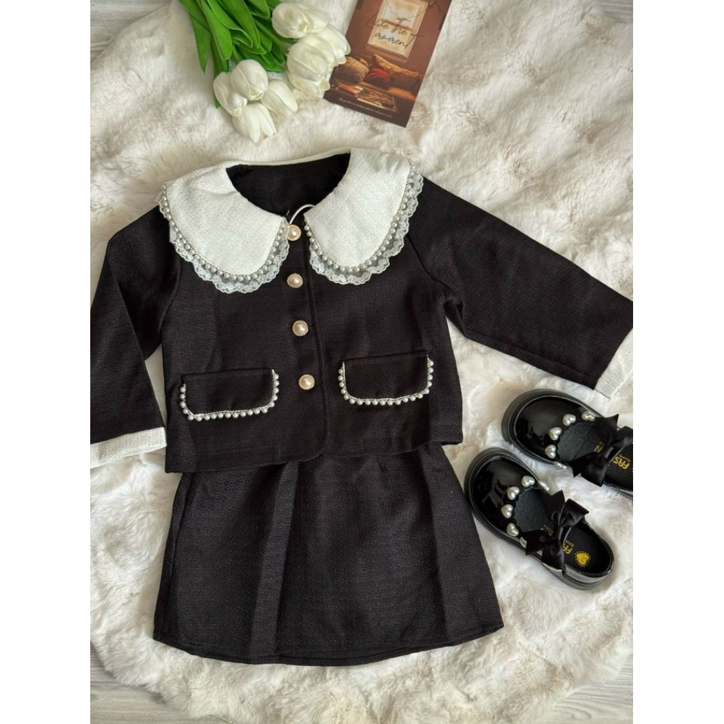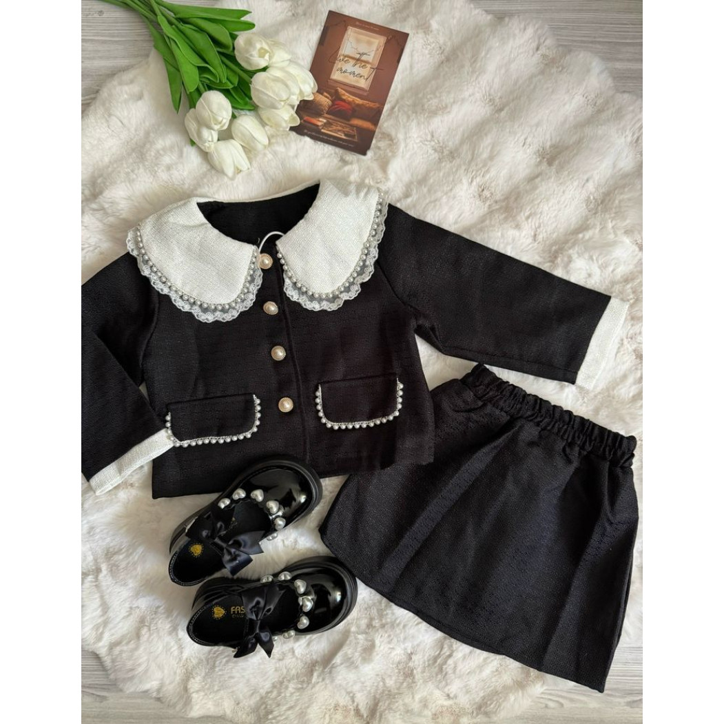 Розкішний комплект у стилі mini Chanel: піджак і спідничка. Виготовлений з якісного матеріалу, прикрашений декоративними перлинками та контрастним білим комірцем. Ідеальний варіант для свят, фотосесій, урочистих подій чи модних виходів у світ.