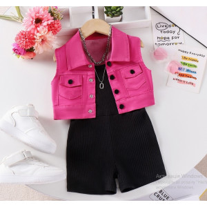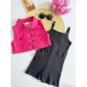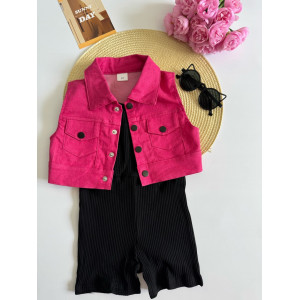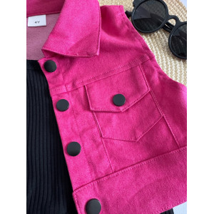 Яскрава джинсова жилетка малинового кольору з модними ґудзиками — додає образу яскравості та характеру.