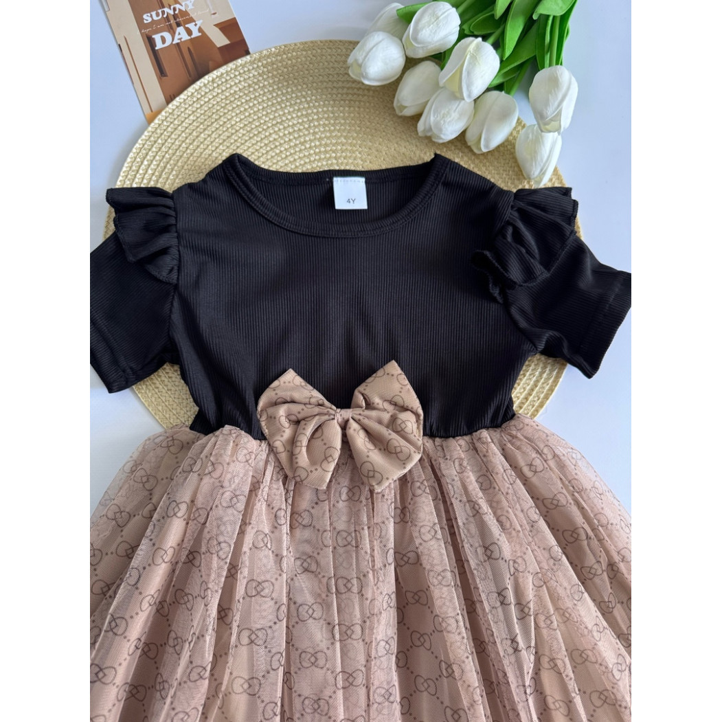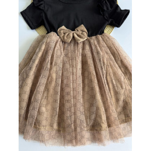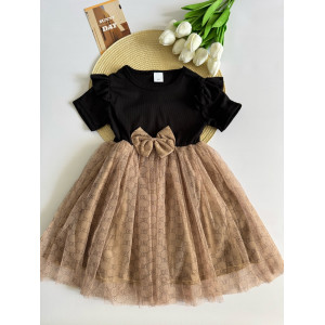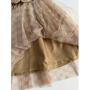 Низ — багатошаровий фатин у бежевому відтінку з трендовим принтом та великою бантом, що робить образ по-справжньому святковим!