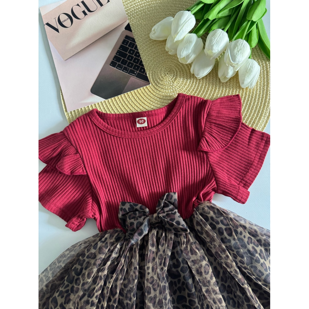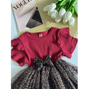 Подаруйте вашій принцесі стильний образ з цією чарівною сукнею! Верх виконаний з м’якого трикотажного матеріалу червоного кольору, що забезпечує комфорт та свободу рухів. Оригінальні рукави-волани додають вишуканості. Родзинкою моделі є пишна сітчаста спідниця з леопардовим принтом та великим бантом на талії — справжній акцент для яскравого образу!