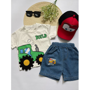 Літній костюм для хлопчика “Трактор Build” — футболка з бавовни + джинсові шорти з кишеньками
