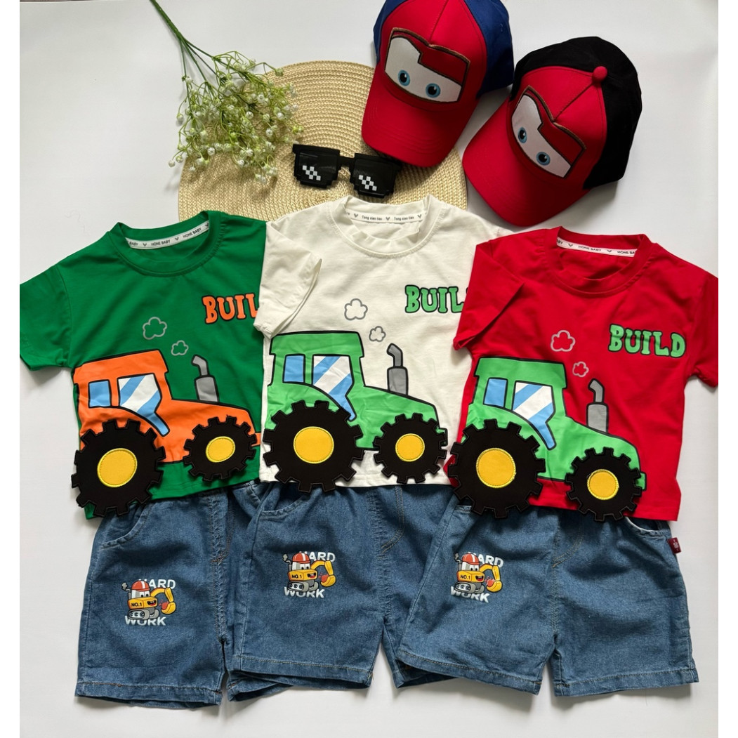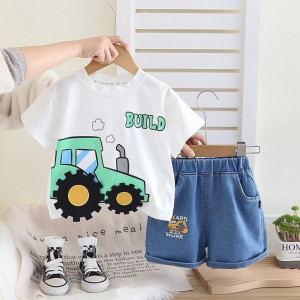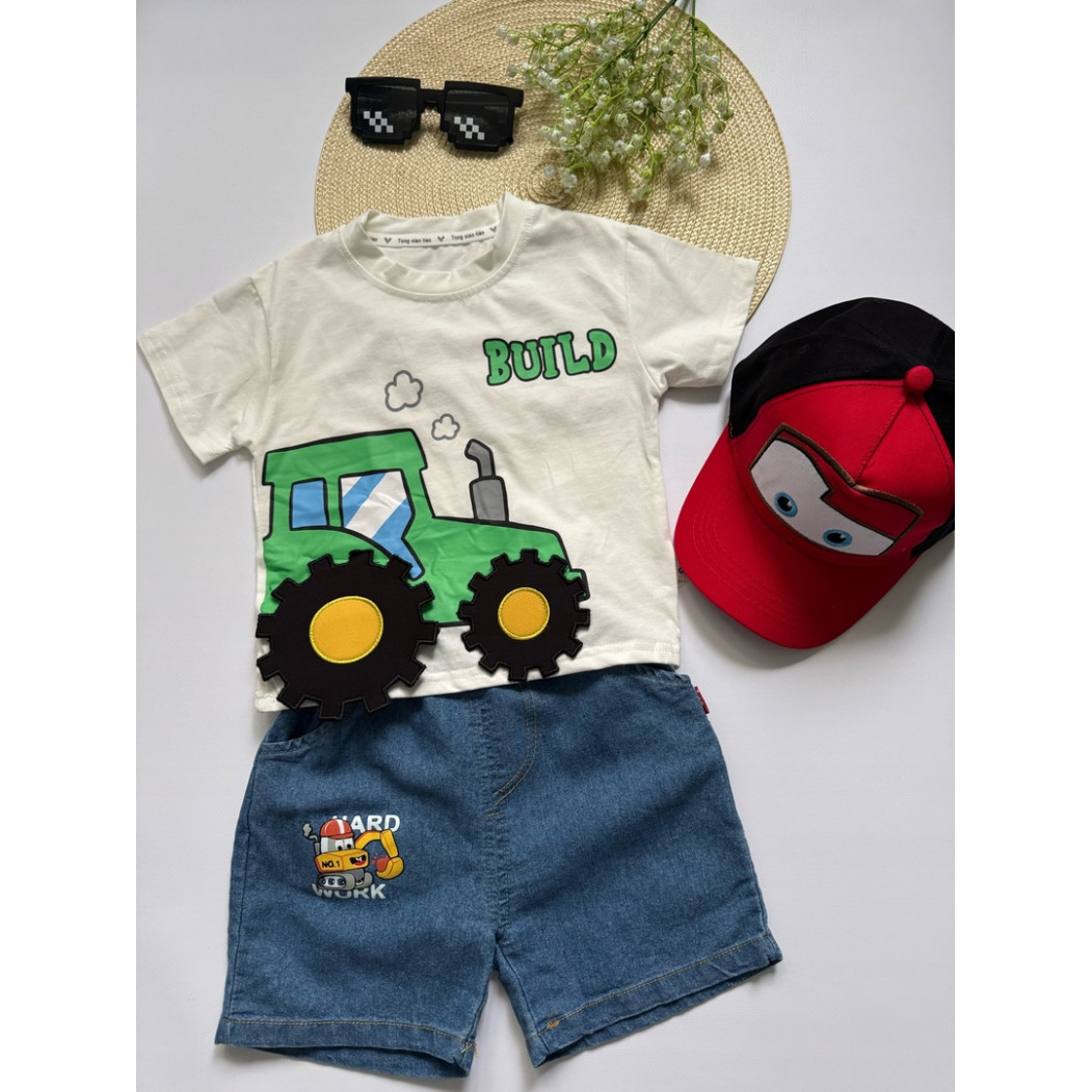 Літній костюм для хлопчика “Трактор Build” — футболка з бавовни + джинсові шорти з кишеньками