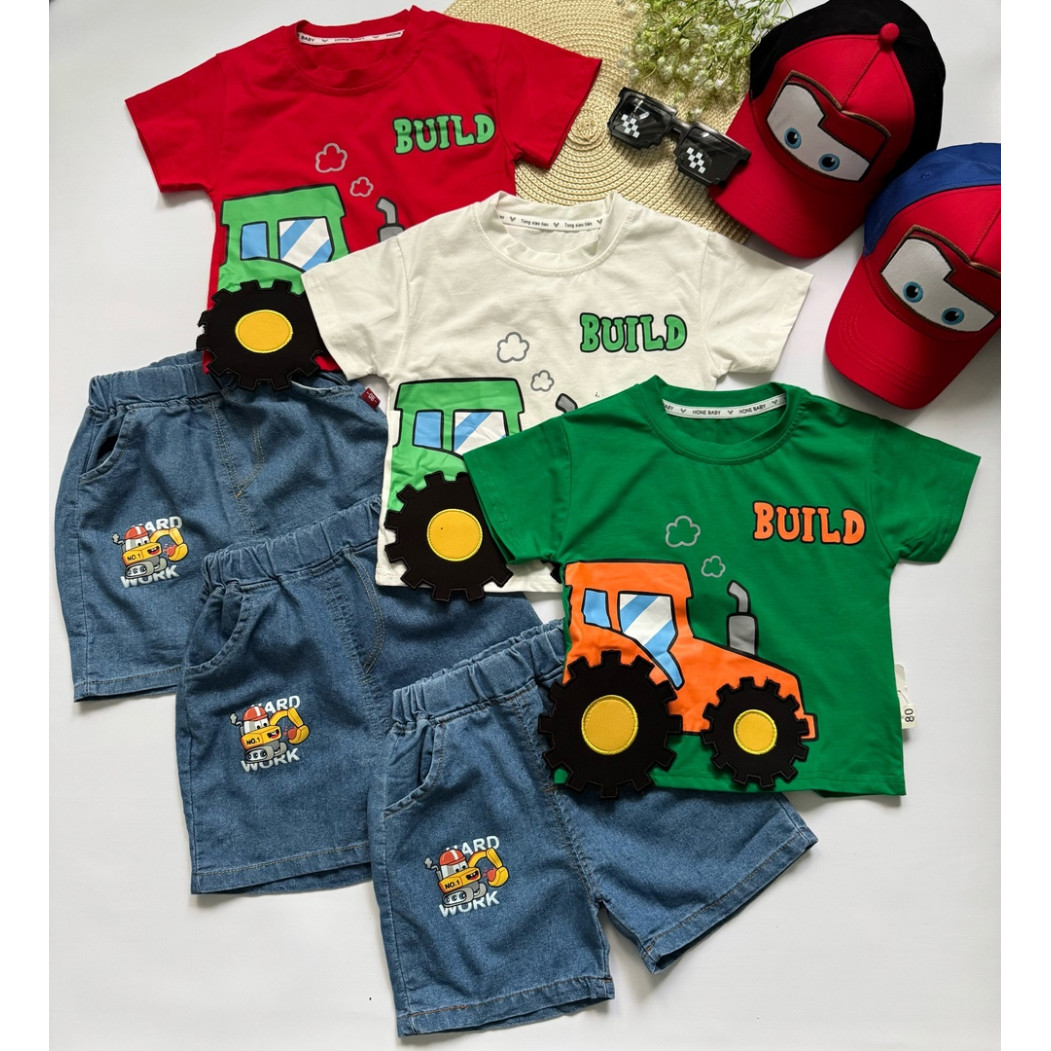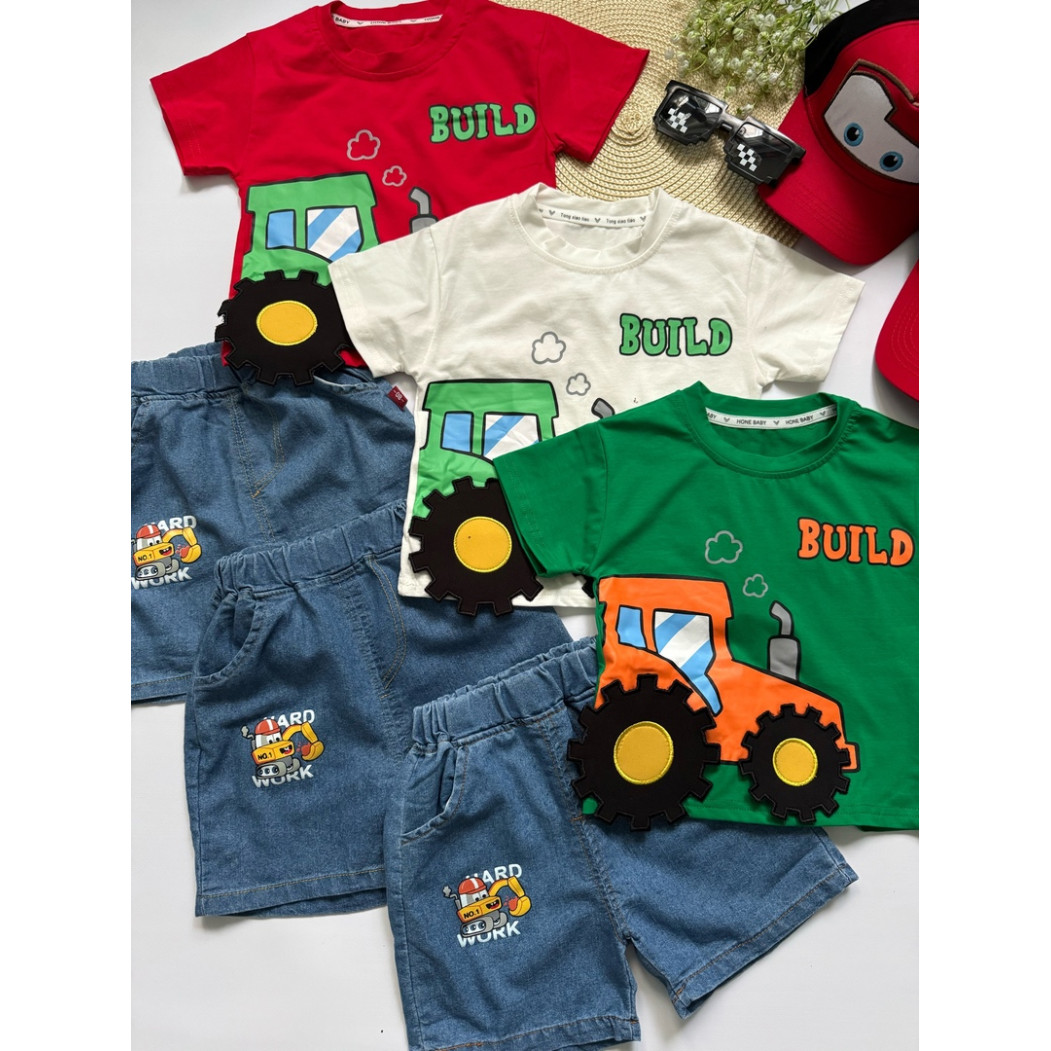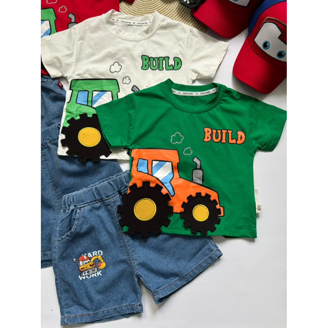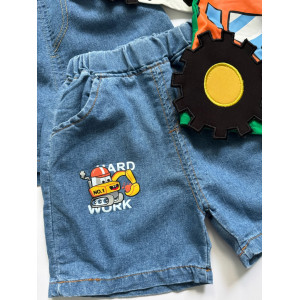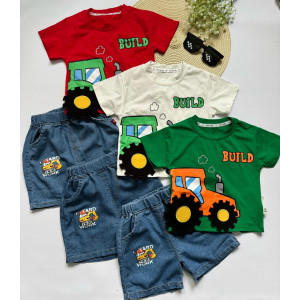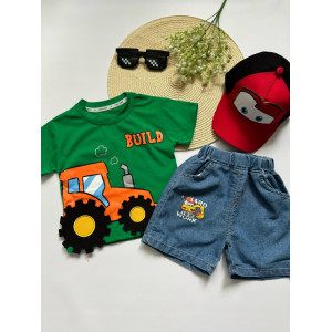 Літній костюм для хлопчика “Трактор Build” — футболка з бавовни + джинсові шорти з кишеньками