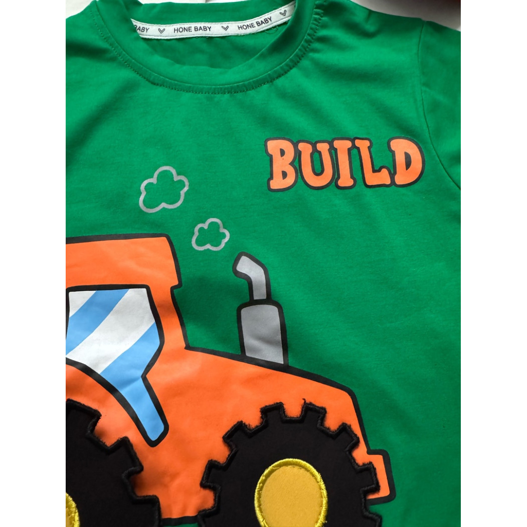 Подаруйте дитині комфорт і радість цього літа з яскравим літнім костюмом “Трактор Build”! Комплект складається з м’якої футболки насиченого зеленого кольору з великим зображенням веселого трактора та надписом BUILD, а також зручних джинсових шортів із кишеньками та кумедною нашивкою HARD WORK. Цей образ підкреслює енергію, допитливість і активність кожного маленького будівельника.