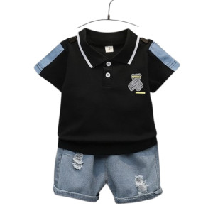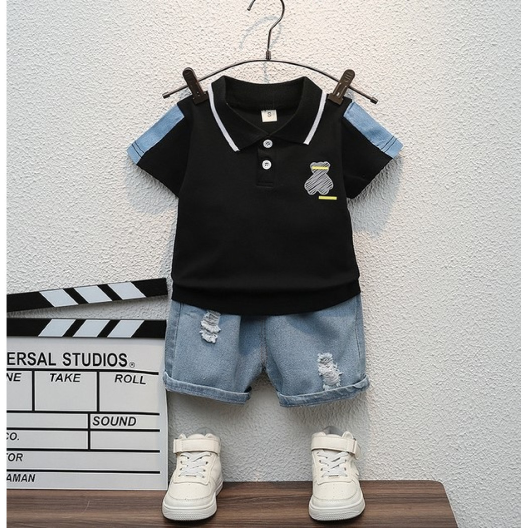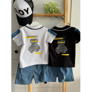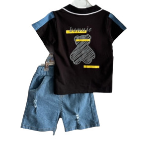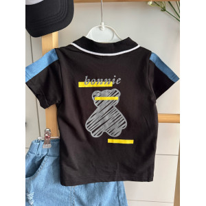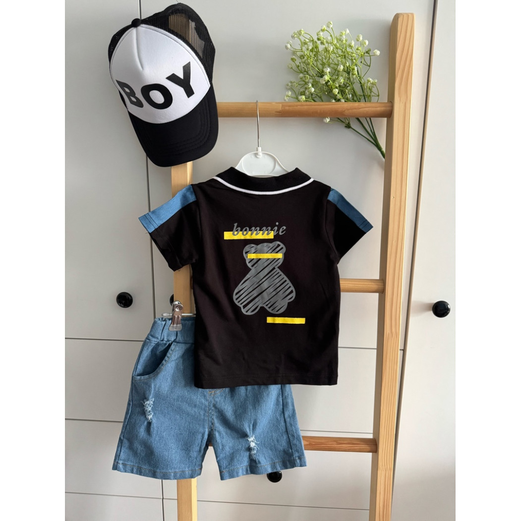 Зустрічайте улюблений образ літа! Легкий, зручний і стильний літній костюм для хлопчика «Bonnie Bear» створений для маленьких дослідників, які обожнюють рух, комфорт і яскраві образи. У комплект входить чорна футболка-поло з милим ведмедиком «bonnie» на грудях та спинці, а також модні джинсові шорти з легкими потертостями — усе, що потрібно для активного і веселого літа!