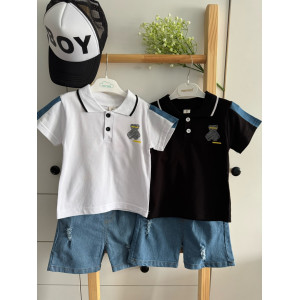 Дитячий літній костюм для хлопчика «Bonnie Bear»: футболка-поло з ведмедиком + джинсові шорти (100% бавовна)