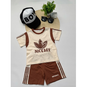 Зустрічайте ідеальний літній образ для маленького чемпіона! Костюм для хлопчика "NICE DAY" складається зі стильної футболки кольору слонової кістки з коричневими вставками та шортів у спортивному стилі. Натуральна бавовна (100%) гарантує легкість, м’якість і відмінну повітропроникність — саме те, що потрібно для активного літа.