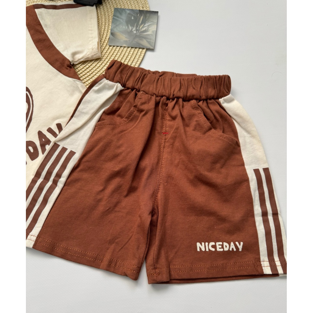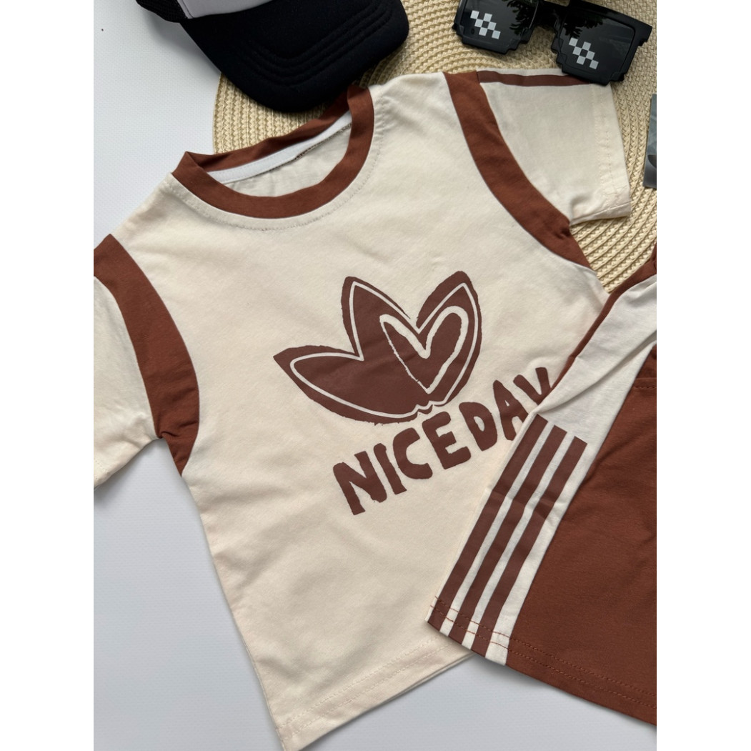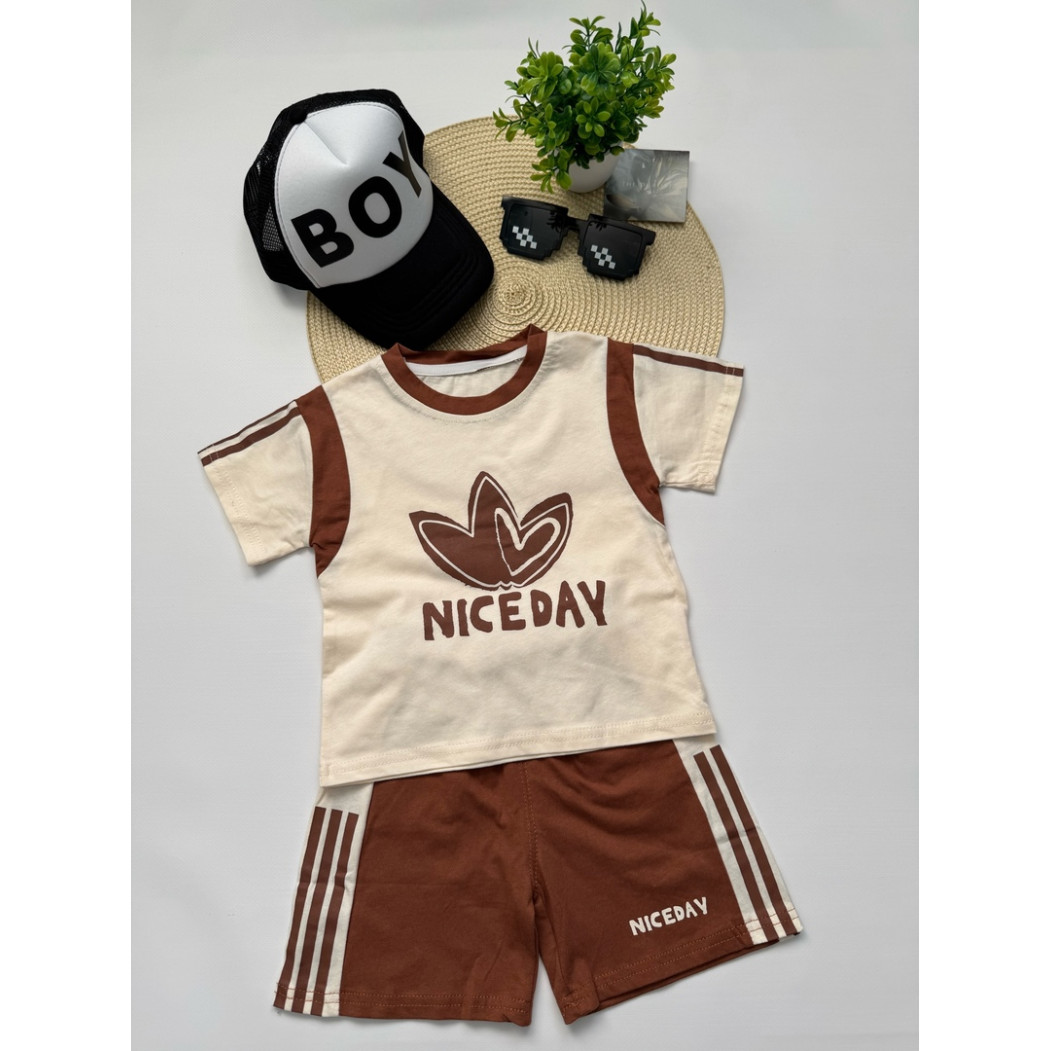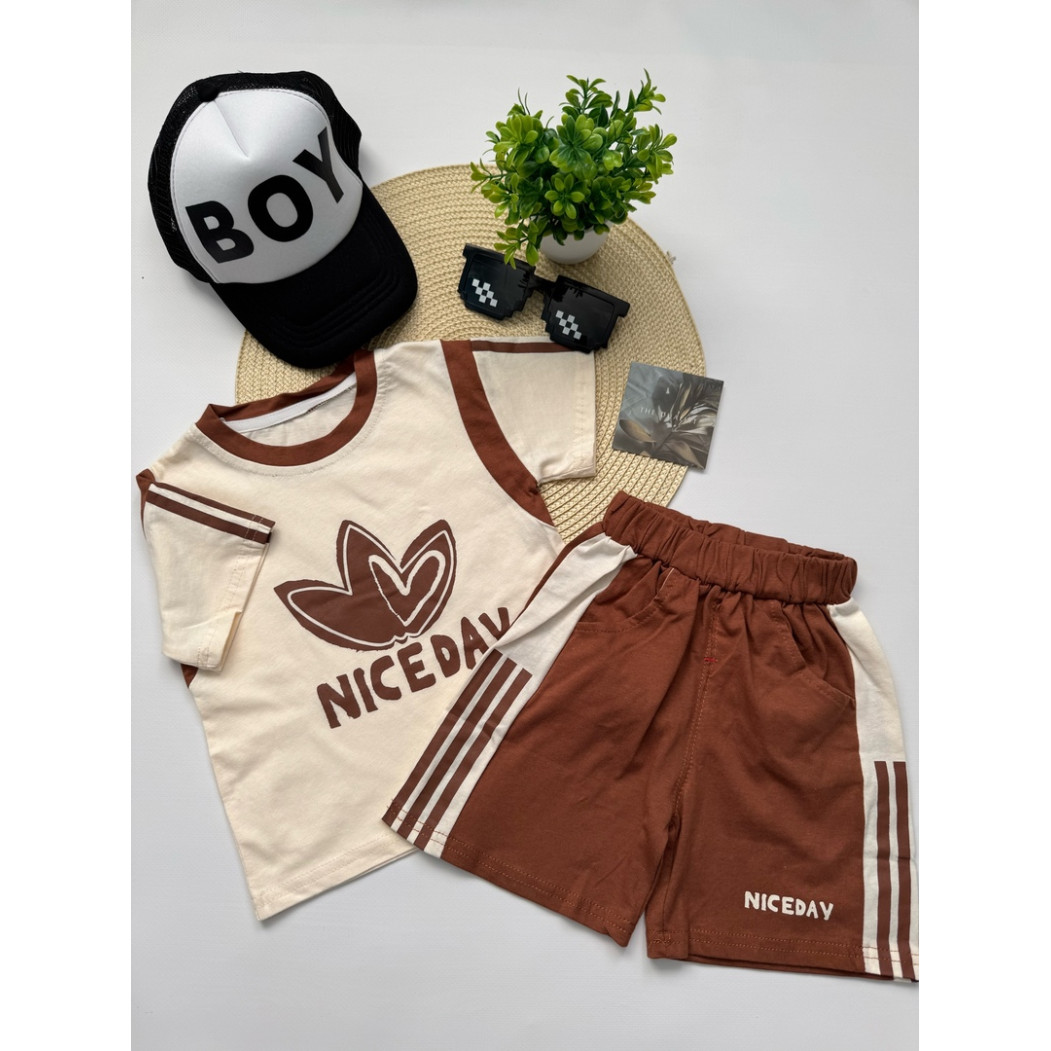 Зустрічайте ідеальний літній образ для маленького чемпіона! Костюм для хлопчика "NICE DAY" складається зі стильної футболки кольору слонової кістки з коричневими вставками та шортів у спортивному стилі. Натуральна бавовна (100%) гарантує легкість, м’якість і відмінну повітропроникність — саме те, що потрібно для активного літа.