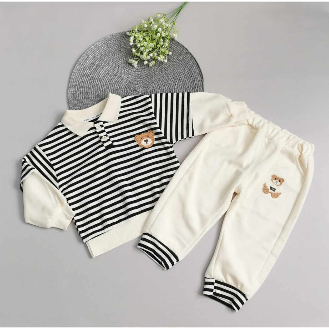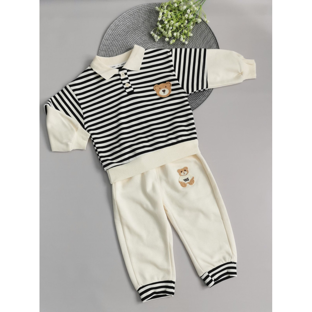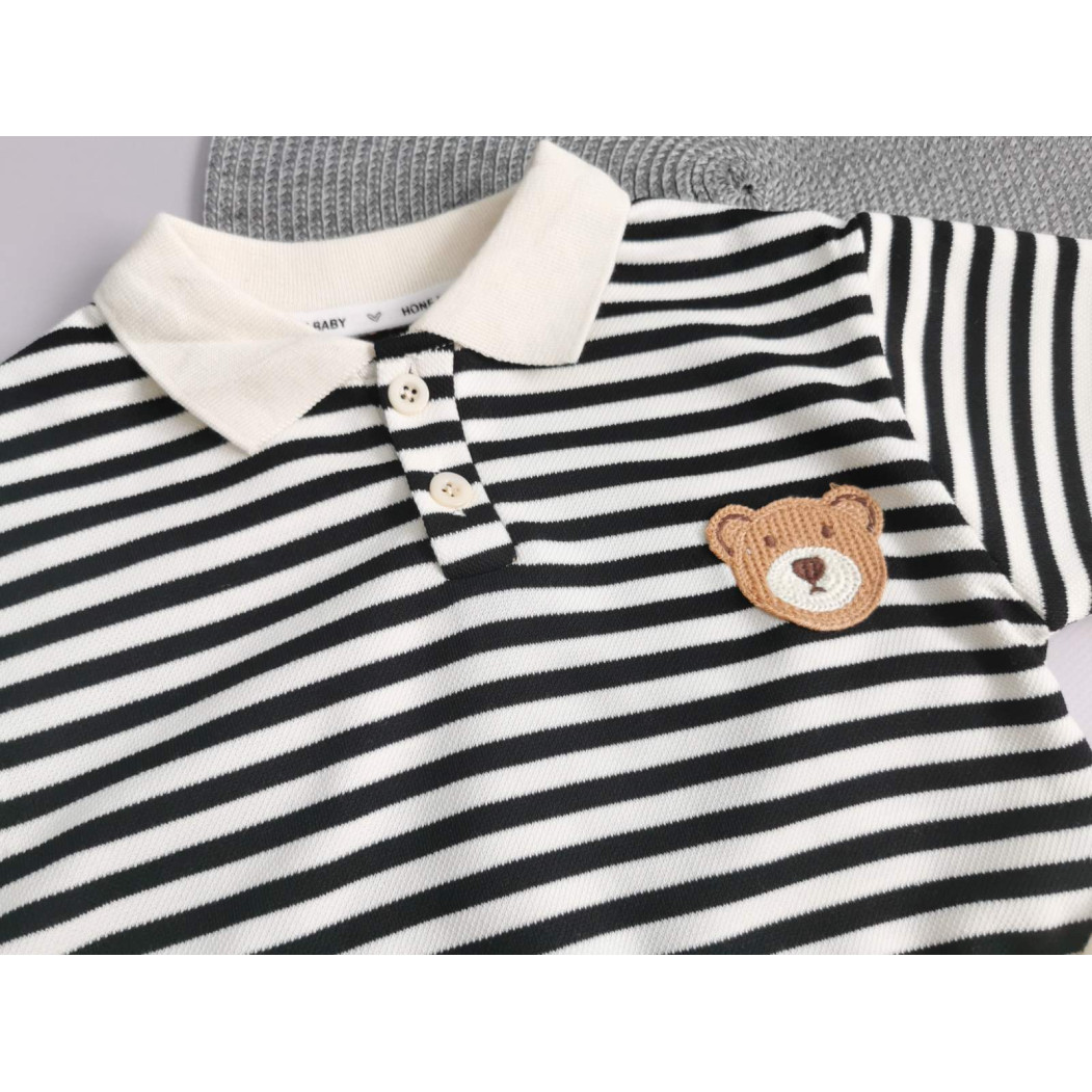 Верх із чорними та білими смужками, прикрашений милим ведмедиком на грудях.