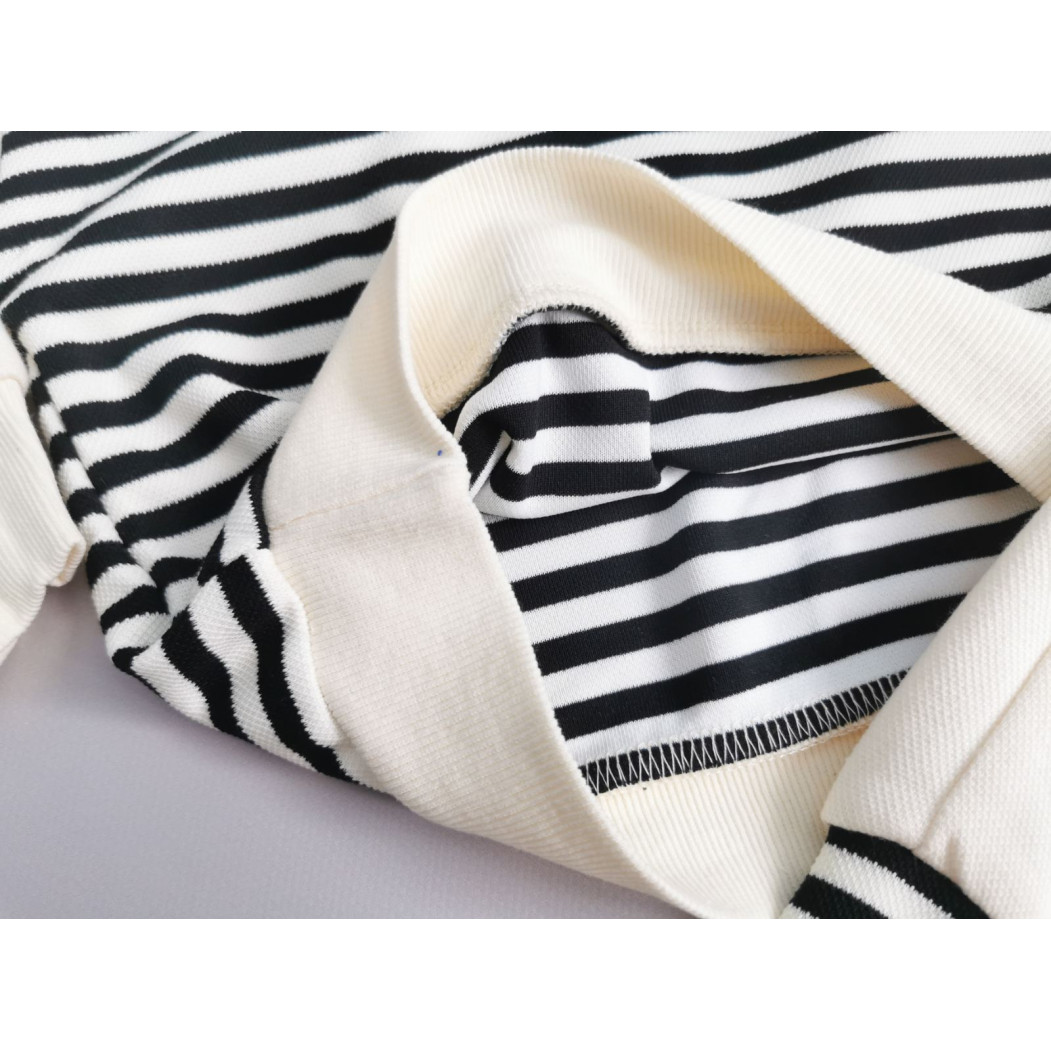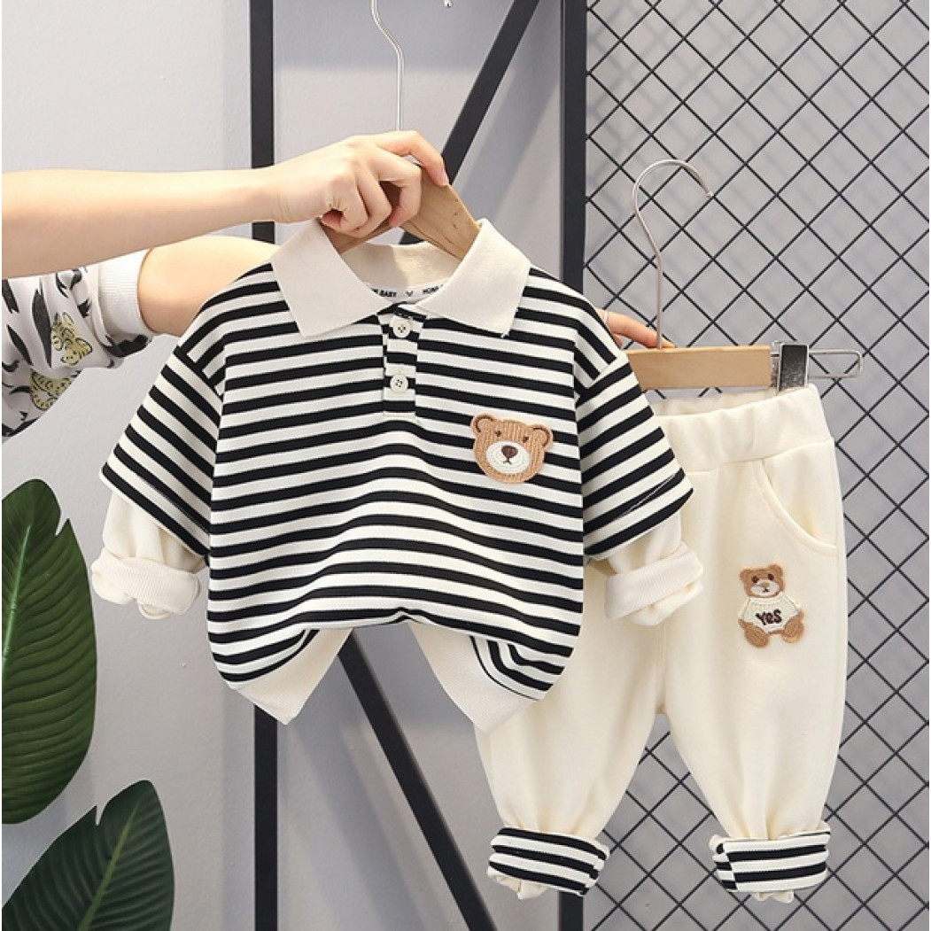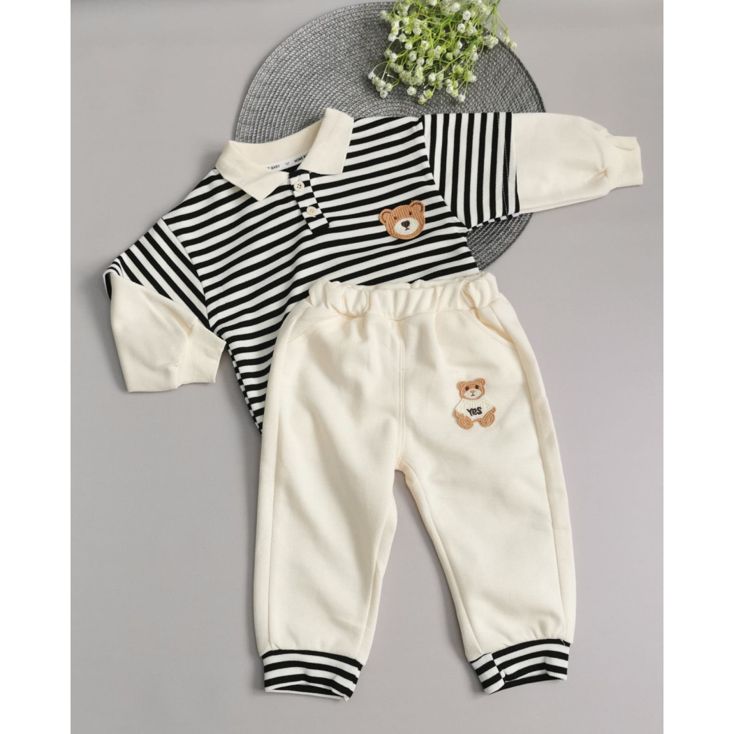 Верх із чорними та білими смужками, прикрашений милим ведмедиком на грудях.